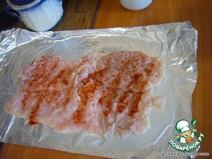 Куриное филе распластать на столе в один слой и слегка отбить. Посолить, смазать солью, перцем, любимыми специями, майонезом.