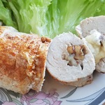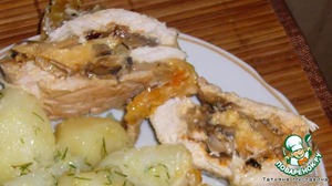 Аккуратно свернуть курицу с начинкой в виде рулета (я сворачивала в фольге), аккуратно выложить на противень; за 10 минут до готовности фольгу раскрыть и рулет сверху смазать майонезом.