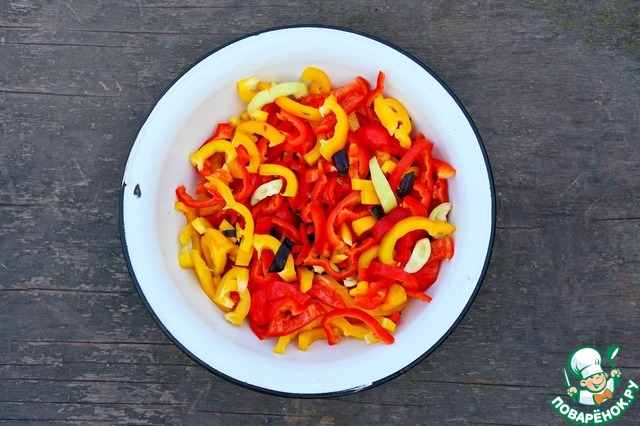 Перец кромсаем произвольными, не сильно мелкими ломтиками.