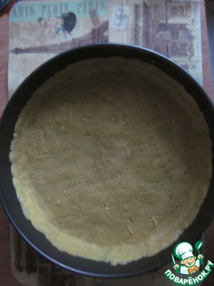 Тем временем тесто в холодильнике достаточно остыло — распределите равномерно по дну формы, формуя высокие бортики. В тесте делаем проколы с помощью вилки и отправляем в холодильник минут на 20. Затем выпекаем корж в течение 10-15 минут при температуре 180°С.