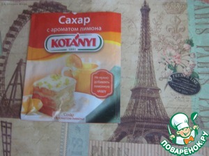 - Сахарная пудра (5 ст. ложек в творожное суфле. 5ст.ложек в белковое суфле. + с ароматом лимона kotanYi 2/3 пакетика в творог. 1/3пакетика в тесто.) — 10 г