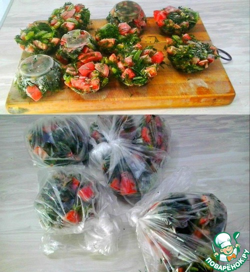 В этом году у меня очень много зелени случилось. Лука зелёного наморозил до неприличия много, а укропа и того больше. Немного поменьше болгарского перца. Насушил и перемолол укропа пол-литровую банку. И вот как вариант ещё один способ. Овощи можно брать в любом количестве. Я напишу то, что использовал я здесь.