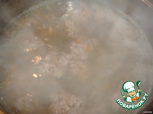 Слепить из фарша фрикадельки и отправить в кастрюлю с кипящей водой (садились батарейки на фотоаппарате, поэтому фотографировала мало).