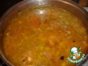 Заправить суп зажаркой, посолить, поперчить, добавить специи (на ваше усмотрение), перед самым концом добавить рубленную зелень.