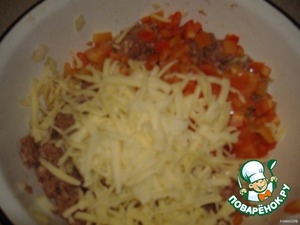 Сыр натереть на крупной терке, 1 луковицу мелко нашинковать, перец нарезать кубиками, все добавить к фаршу, посолить, поперчить, приправить специями для фарша.