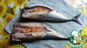 Рыбку выпотрошить (удалить внутренности и голову), помыть и обсушить. У меня попалась с икрой, поэтому я решила положить её внутрь (но это не обязательно).