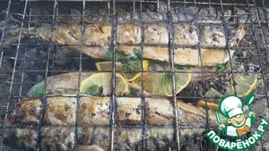Вот готовая рыбка. Примерное время приготовления на мангале 15-20 минут, зависит от жара.