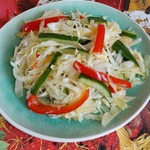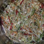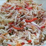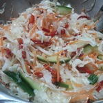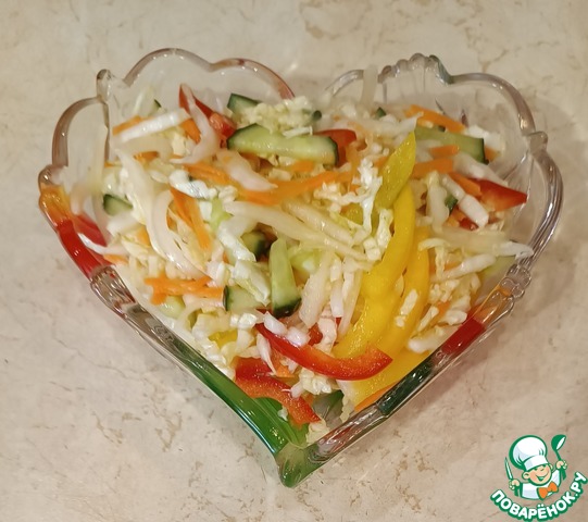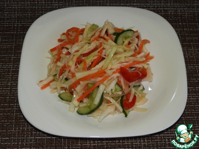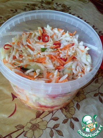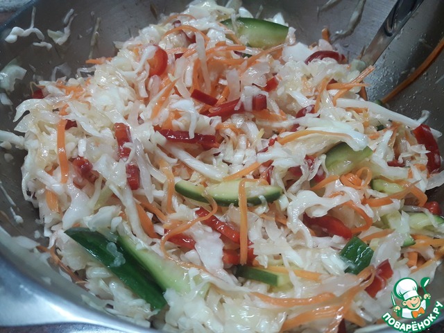 Такой салат я все время покупала на рынке, уж больно он нам нравится, но никак не могла найти пропорции продуктов, но "не Боги горшки обжигают"... Вот уже не первый год я не захожу в тот отдел, не покупаю, а делаю его сама. Причем, гораздо вкуснее...