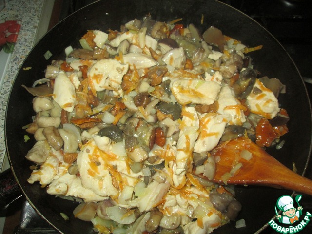 Теперь очередь за грибочками. Выкладываем их на сковородочку, перемешиваем и хорошенько обжариваем все вместе. Соль, перец и приправы добавляем по вкусу.