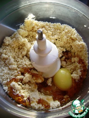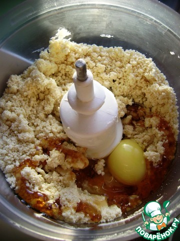 В чашу комбайна высыпать просеянную с крахмалом муку, добавить соль и нарубленное кусочками холодное масло. Пробить в крупную крошку в пульсовом режиме.