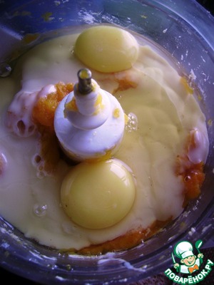 Пробить в чаше комбайна до полной однородности тыквенное пюре, яйца, сгущенку и маскарпоне. Всыпать просеянный с разрыхлителем крахмал и добавить ванильный экстракт. Еще раз пробить и вылить начинку на тесто.