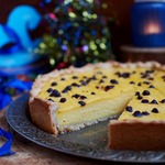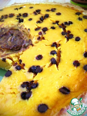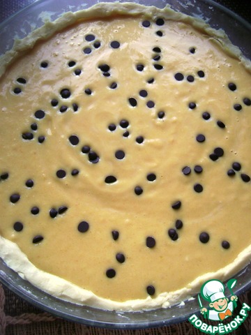 Посыпать шоколадными каплями для выпечки и поставить в разогретую до 200 градусов духовку. Печь до легкого подрумянивания краев и остывания теста от формы. Убавить нагрев до 150 и печь еще 20 минут. Края должны хорошо зарумяниться, крем загустеть и чуть пружинить по краям. Серединка будет мягкой, но не жидкой. Оставить тарт в духовке до полного остывания.