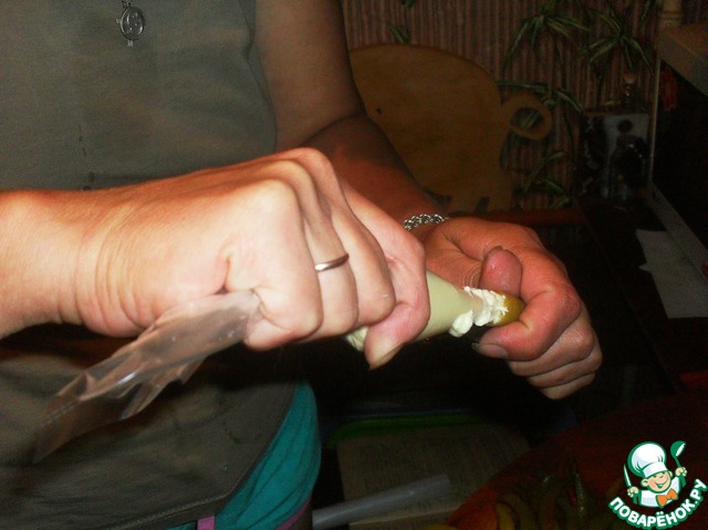 Потом сыр с чесноком перекладываем в корнетик и выдавливаем сыр в перчики. -