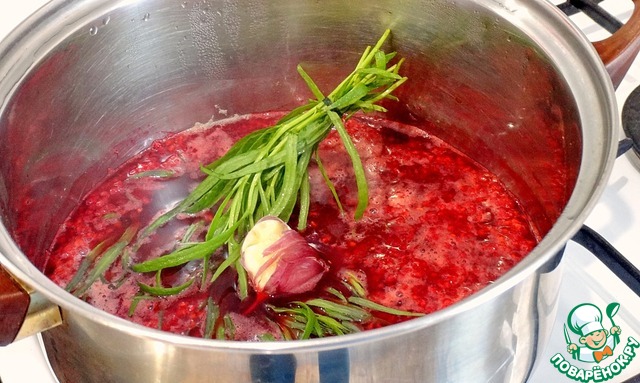 Добавить к малине чеснок и эстрагон, закрыть кастрюльку крышкой и оставить на 10-15 минут, чтобы малина пропиталась пряностями. -