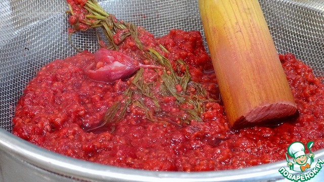 На кастрюлю для варки варенья поставить сито, выложить малину. Эстрагон и чеснок удалить, а малину протереть деревянной ложкой или толкушкой через сито.
