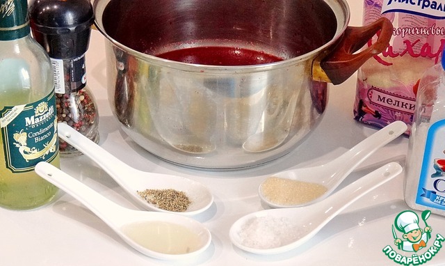 В малиновом соке развести агар-агар. хорошо перемешав. Добавить сахар, соль, белый винный уксус и смесь перцев по вкусу.
