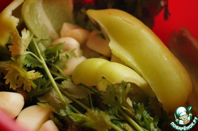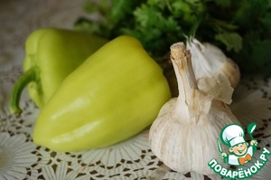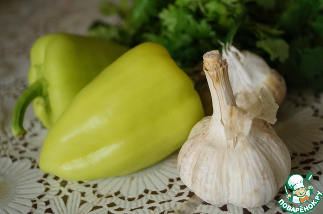 Чистим чеснок, отрезаем утолщения у зелени и очищаем внутренности у перца. -