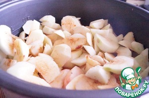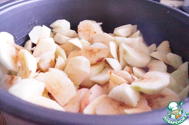 Дольки складываем в кастрюлю, наливаем 100 г воды, закрываем крышкой и развариваем до полной готовности, периодически мешая.