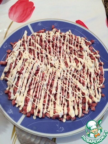 Далее на колбасу майонез добавляем мелкой сеткой.