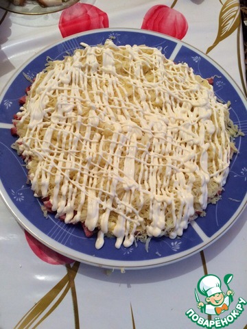 На мелкой терке трем отварной картофель. И так же покрываем мелкой сеткой майонеза.