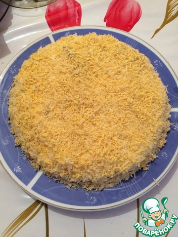 В этом салате все ингредиенты идут слоями, а нежность ему придает то, что натерто все на мелкой терке. Я делаю этот салат на большом блюде, кол-во ингредиентов написаны на мою большую тарелку (диаметром 25 см. примерно). НУ, НАЧНЕМ! -