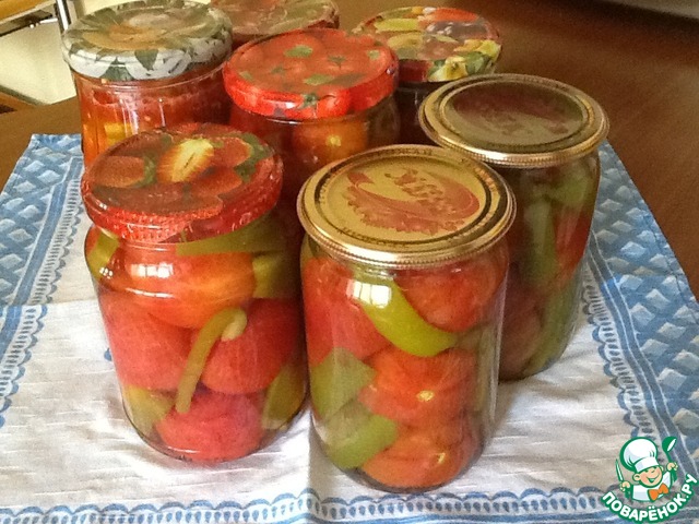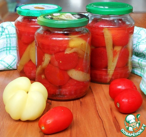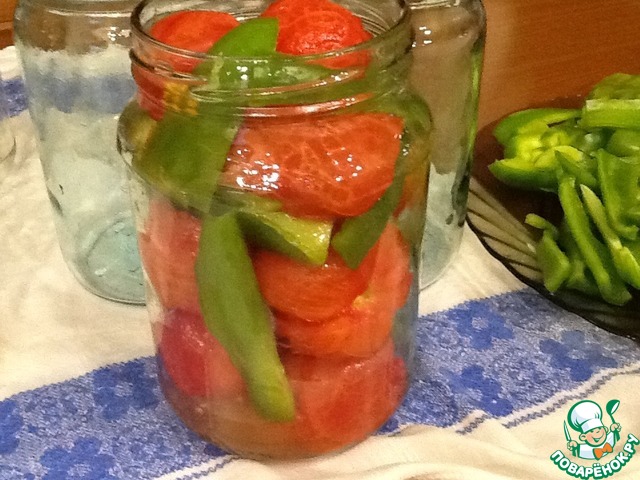 Банки наполнить очищенными помидорами, чуть прижимая их. По краям и в пустоты положить перец. Как на фото.