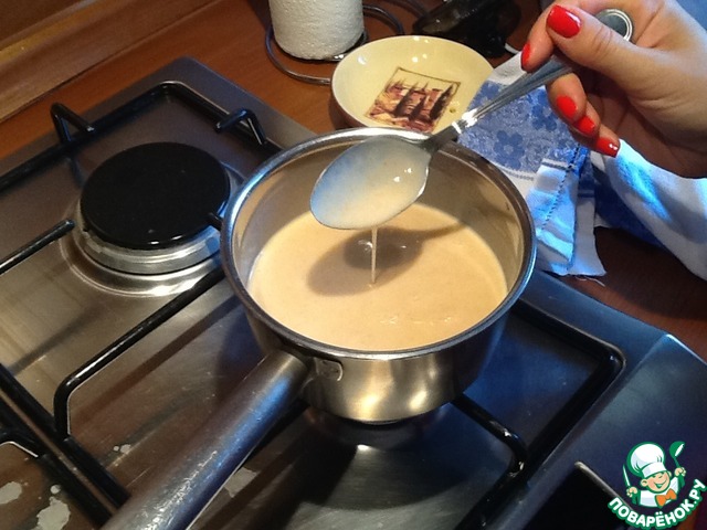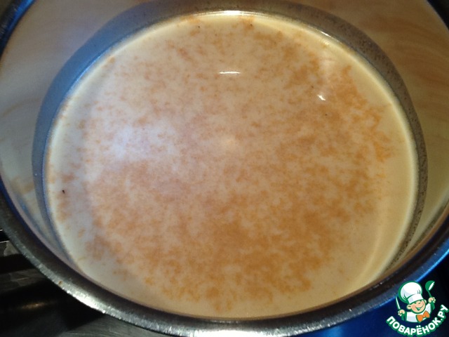 Добавить туда молоко. Оно запенится, не пугайтесь. Поварить чуть-чуть, чтоб загустел сироп. Отставить в сторону.