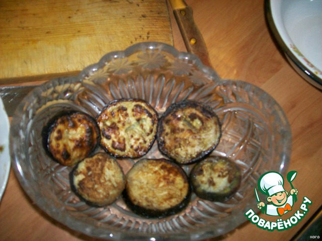 • Кружочки баклажан обжарить с обеих сторон до золотистого цвета в раскаленном масле, выложить на бумажное полотенце и остудить.