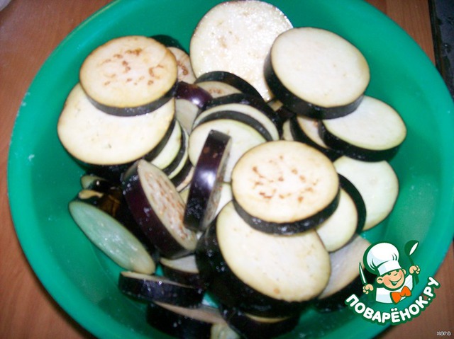 • Баклажаны, не очищая от кожицы, нарезать кружочками толщиной 1 см, сложить в миску, обильно посолить и оставить на 20-30 мин. Затем промыть и обсушить.