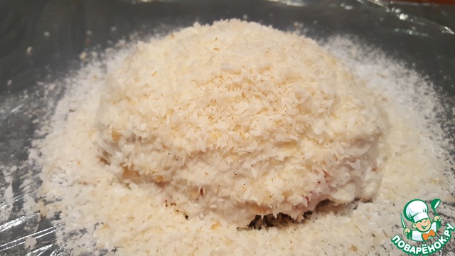 Выкладываем одним комочком сыр и присыпаем оставшейся стружкой и пудрой. -