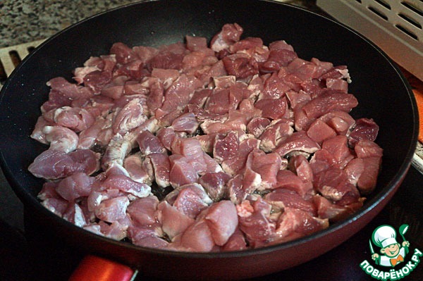 Мясо порезать узкими полосками, как режете говядину на бефстроганов, или произвольно, но некрупно. -