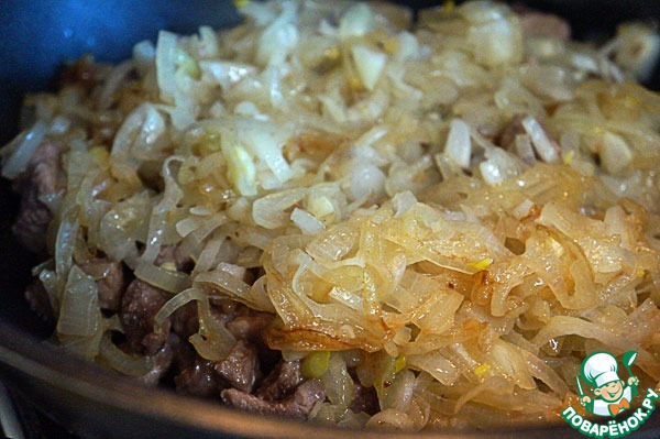 На оставшемся в сковороде жире поджарить лук до светло-коричневого цвета. Выложить его на мясо, посолить (не усердствуя: будем добавлять соленый рассол), жарить вместе минут 10.