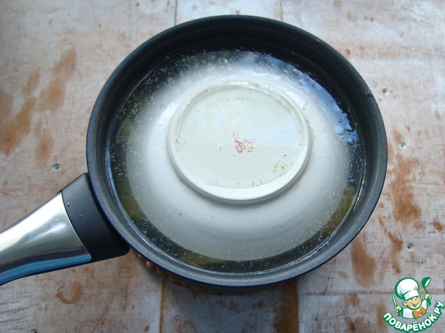Заливаем бульоном, чтобы он покрыл верх и сверху прижимаем тарелкой, чтобы листья в процессе варки не развернулись.