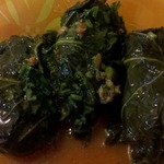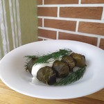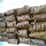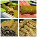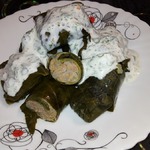 Долма, сделанная с листьями местного винограда. Фарш для долмы сделала из куриной грудки, с добавлением риса, моркови, лука, чеснока и зелени.