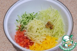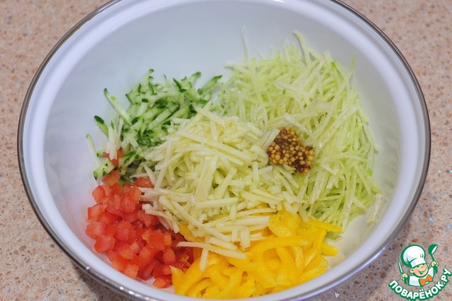 Ингредиенты соединить в миске, добавить французскую горчицу, соль и сахар по вкусу.