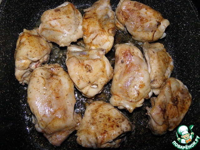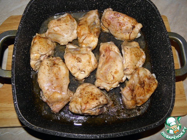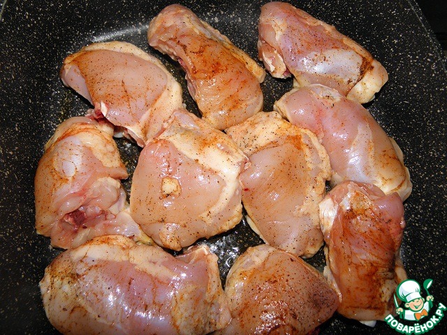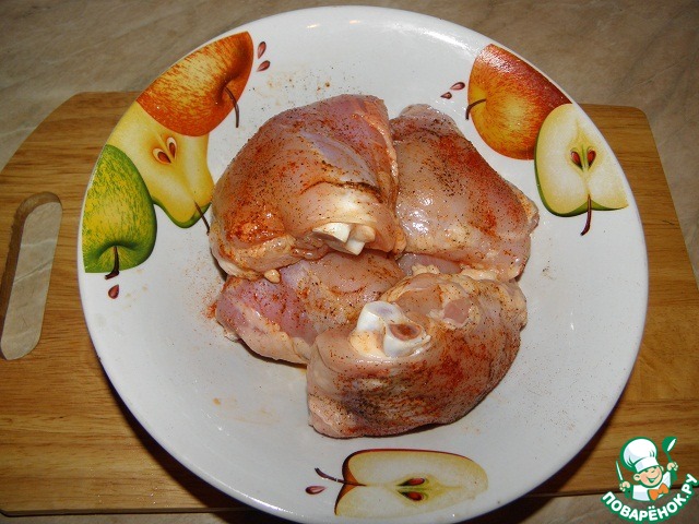 Бедра вымыть, обсушить полотенцем, снять кожу, добавить специи (паприка, соль, черный перец).