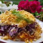 Далее: лук - тертое сливочное масло - тертые желтки - майонез.