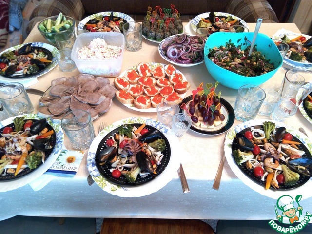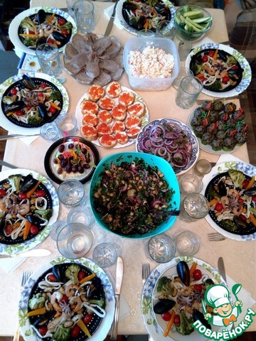 Салат из морепродуктов. Впервые попробовала в ресторане, когда муж пригласил меня на мой день рождения. Теперь это завсегдатай на наших домашних праздниках. В этот раз я готовила его на даче на день рождения мужа. Вкусный, легкий, для любителей всего морского.