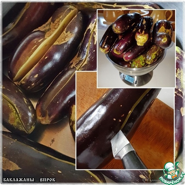Была мысль – хвостики оставить, но «а к чему оно?»…, в общем хвостики оторвали. Каждый баклажан надо надрезать. Вдоль. На всю глубину, но не разрезая, конечно, насовсем.