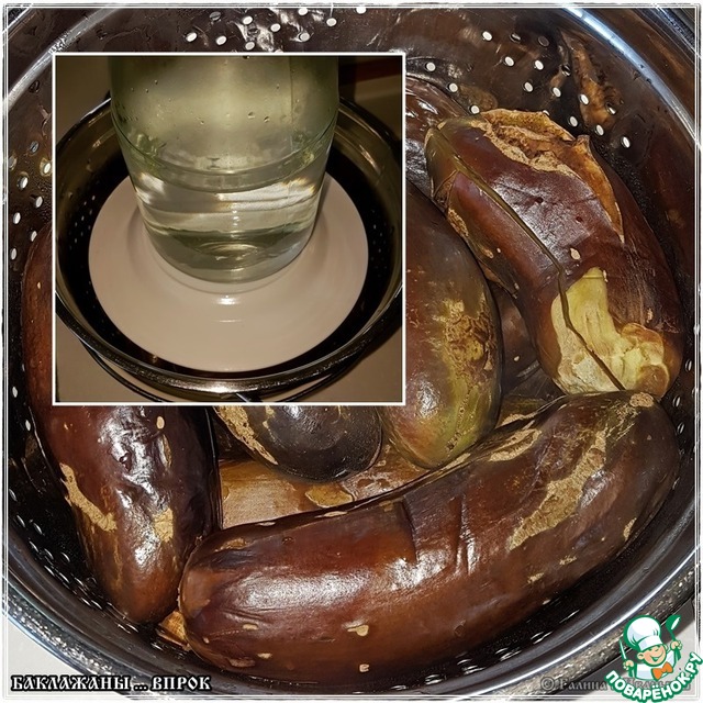 Сложить баклажаны в дуршлаг, накрыть тарелкой и поставить сверху не очень тяжелый гнет. Чтобы ягоды не помять, но влагу излишнюю выдавить.