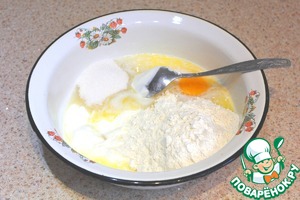 В миску добавить ингредиенты для теста: Муку -2,5 стакана, соду 1/2 ч. ложки, яйцо - 1 шт., 5 ст. ложек сметаны, 1/3 стакана сахара, 1/2 ч. ложки соли, растопленное сливочное масло. Замесить тесто.