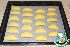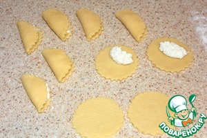 Тесто раскатать в пласт толщиной 5 мм, выемкой для печенья вырезать окружности диаметром 8-9 см. Выложить на середину творожную начинку (1,5 ч. ложки). Края соединить с легким нажимом.