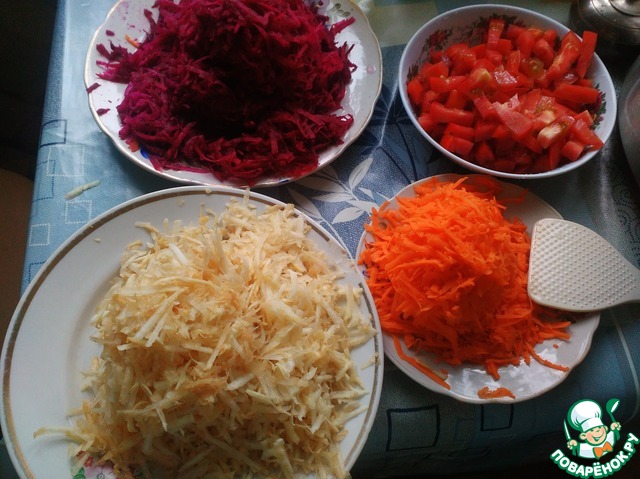 Данный рецепт рассчитан на 7-литровую кастрюлю. Для скороварки с кастрюлей 5 литров я беру продуктов процентов на 20 меньше, соотношение такое же :) Описание даю на оба случая. Этот вариант борща - на телячьей мякоти. Особенность данного рецепта - использование заправки, которую можно готовить на несколько раз и хранить в холодильнике. Наверное, можно даже закрывать на зиму, но я не фанат заготовок :) В данном рецепте отсутствует сахар, так как используется естественная карамелизация овощей. Корректировка цвета уксусом или лимоном также не используется - бережная обработка свеклы не дает потерять цвет. Листала рецепты борщей - вроде, не нашла такого. То соотношение продуктов другое, то принципы приготовления... В общем, извините, если такой рецепт уже есть :))