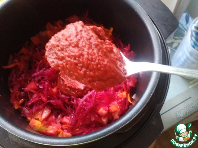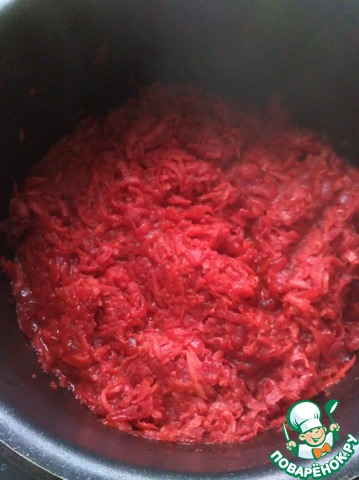 4) Тушим нашу заправку в течение примерно 5 минут на среднем огне, т. к. нам надо, чтобы свекла карамелизовалась. При необходимости добавляем немного воды. Должно выглядеть вот так: