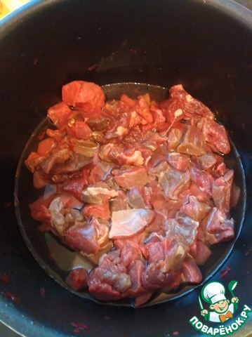 Загружаем мясо (у меня - телячья мякоть) в чашу скороварки, добавляем воду, чтобы покрыла дно. Включаем скороварку в режиме «Высокое давление» на полчаса (мясо-то готово и раньше, но я перестраховываюсь).