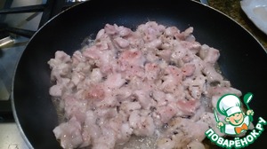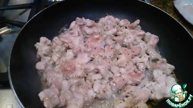 Курицу режем кубиком, обжариваем на высоком огне. Откладываем в сторону