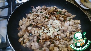 Курицу обратно к грибам, даем время немного подружиться. Выдавливаем чеснок