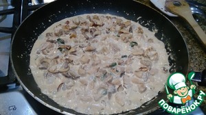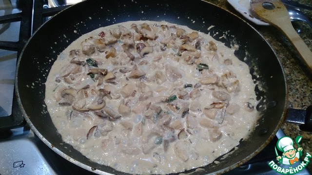 Выливаем сливки, даем закипеть, постоянно помешивая. Уменьшаем огонь и ждем загустения (минут5). На этом этапе снимаем пробу и восстанавливаем баланс вкуса солью, перцем или любимыми специями. Хорошая идея добавить немного тертого мускатного орешка (я так и сделала)