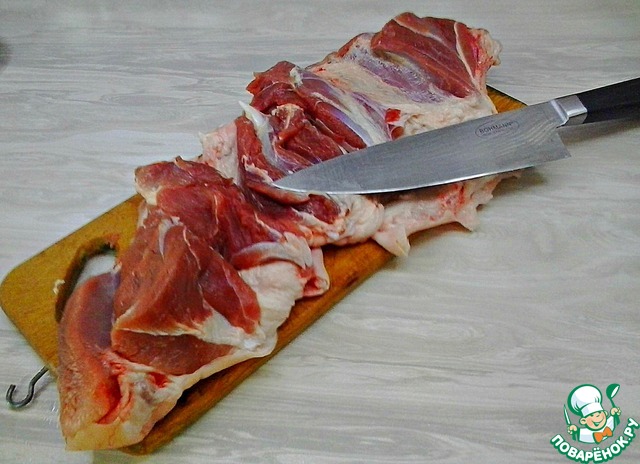 Вымытую и обсушенную рульку надрезаем острым ножом большим вдоль кости, и при помощи маленького ножа вырезаем кость, стараясь оставить на ней как можно меньше мяса.