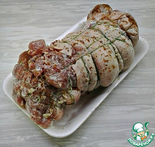 После чего сворачиваем её рулетом, и крепко обматываем нитками. Снаружи рульку так же ( прямо поверх ниток) обмазываем майонезной смесью и чесноком. Убираем в холодильник на 6-8 часов посуде, накрытой крышкой. -